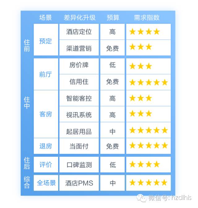 为了提升酒店竞争力免不了要对酒店现有资源进行升级改造,但这是一项大工程,费时费力,贯穿在酒店整个运营环节当中有无数细节具备可优化的空间,但预算是有限的,人力成本也是居高不下,酒店管理层人员应综合考虑各环节对酒店客户体验的影响力大小、所需要投入的预算及人力、还有投入产出比,来做一个整体的规划。以下内容是我们根据“住前、住中、住后”三大环节中一些重要的应用场景来做了一个对比图。